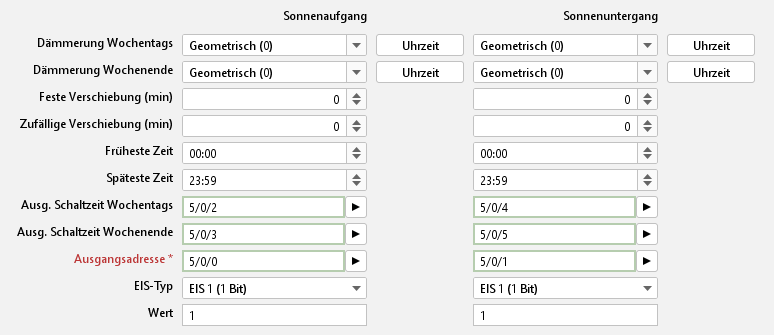 Dieser Zeitpunkt ist der Ausgangsmoment, von dem aus ggf. alle weiteren Berechnungen erfolgen (Verschiebung etc.). Außerdem wird hier bestimmt, ob es sich um einen Sonnenaufgang, Sonnenuntergangs, Sonnenhöchststand oder um einen festen Schaltzeitpunkt handelt.