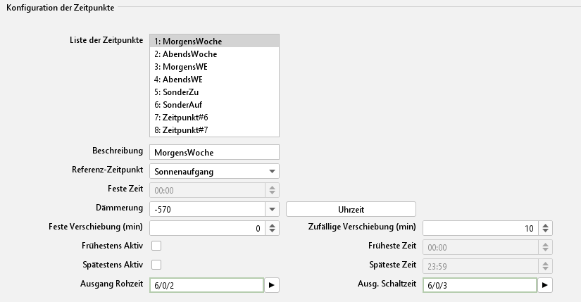 In diesem Konfigurationsfeld werden die Zeitpunkte festgelegt die später in der „Konfiguration der Ausgänge“ genutzt werden sollen. Es können maximal 8 Zeitpunkte angelegt werden. Um einen Zeitpunkt anzulegen, wird dieser in der „Liste der Zeitpunkte“ markiert und entsprechend konfiguriert. Die Zeitpunkte sollten mit einem eindeutigen Namen versehen werden