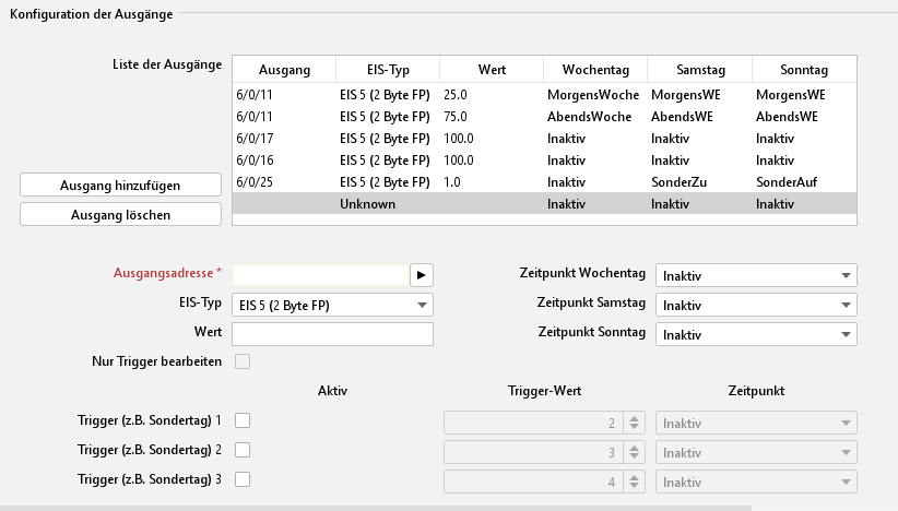 Um einen neuen Ausgang hinzufügen, muss ein neuer Eintrag in die Liste eingefügt werden. Dies geschieht in dem der Button „Ausgang hinzufügen“ angeklickt wird. In der Liste der Ausgänge erscheint ein markierter Eintrag „Unknown“ und die Eingabefelder darunter werden freigeschaltet.