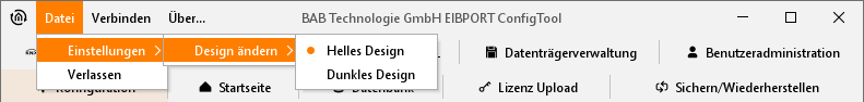 Über „Datei >Design ändern“ können Sie die Ansicht des ConfigTool in ein helles Design oder dunkles Design wechseln.