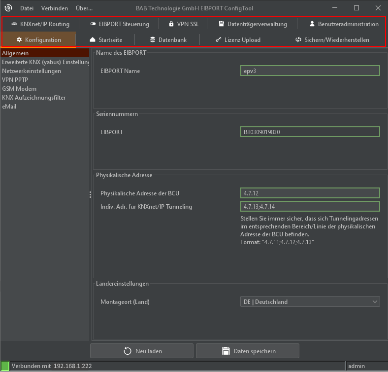 Das ConfigTool ist in verschiedene Bereiche aufgeteilt, dargestellt durch Tabs. Beim Start öffnet sich immer der erste Tab „Konfiguration“.