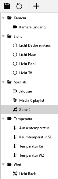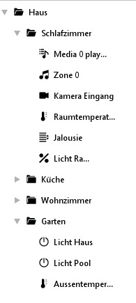 Die mittlere Spalte entspricht der Ansicht in der Visualisierung. Die Einteilung, die hier vorgenommen wird, ist auch später im Smartphone Browser zu sehen. Der Benutzer legt selbst Ordner an und verteilt die Elemente beliebig. Ein Ordner wird über das Kontextmenü (Rechtsklick in die Spalte) angelegt. Die vorher in der linken Spalte parametrierten Elemente werden einfach per „Drag and Drop“ in die gewünschten Ordner gezogen. Eine Einteilung der Darstellung kann zum Beispiel nach Etagen und Räumen und/oder Funktionen geschehen. Zum Löschen eines Elementes oder eines ganzen Ordners wird das Kontextmenü verwendet.