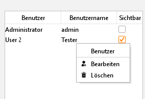 Im Menü befindet sich eine Tabelle mit den angelegten Benutzern. Im Auslieferungszustand ist nur der Benutzer „Administrator“ angelegt. In der ersten Spalte wird der tatsächliche Name und in der zweiten Spalte der Benutzername angezeigt. Die letzte Spalte zeigt an ob der Benutzer sichtbar ist oder nicht. Diese Spalte ist nur eine Information, ob der Benutzer im Auswahlmenü der Anmeldung sichtbar ist oder nicht, kann in den Benutzereinstellungen fest-gelegt werden.