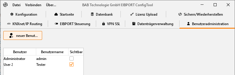 . Hier wird der Benutzerzugriff auf den Editor und das ConfigTool administriert. Um den Zugriff auf die Visualisierung und deren Projekte zu verwalten, muss die Benutzerverwaltung im Editor aktiviert werden.
