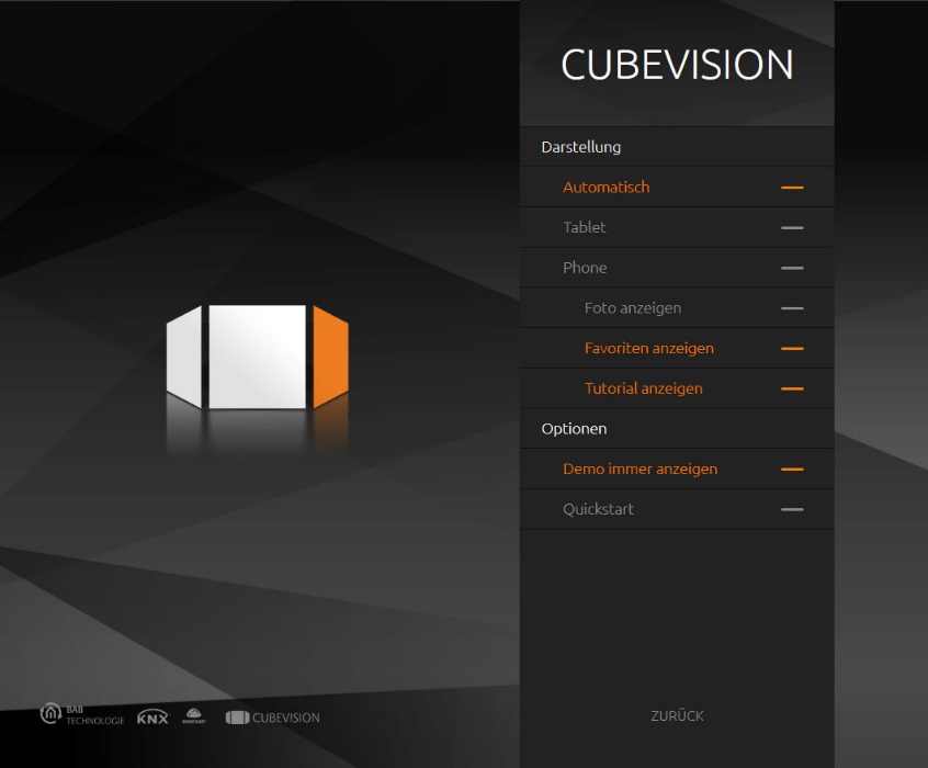 Die CUBEVISION hat zwei Darstellungsformen. „Tablet“ bezeichnet die 3-D-Würfel Darstellung für Geräte mit größeren Displays, „Phone“ die Darstellung für kleinere, bspw. Smartphone, Displays. Über die Einstellung „Automatisch“ wird die jeweilige Darstellung in Abhängigkeit der Auflösung von der CUBEVISION selbst gewählt. Die Visualisierung skaliert automatisch auf die Bildschirmgröße