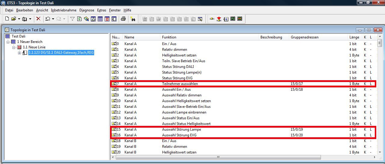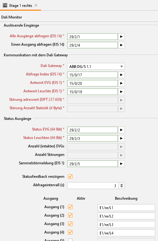 Der Dali Monitor Job im EIBPORT V3 kann ausschließlich in Kombination mit dem Dali Gateway des Type ABB DG/S 1.1 Leuchtmittel und die dazugehörigen elektronischen Vorschaltgeräte (EVG), auf Defekt überwachen. Das ABB DG/S 1.1 verfügt über 2 Kanäle (Kanal A und Kanal B) die jeweils 64 Teilnehmer ansteuern können. Pro Kanal kann ein Dali Monitor Job eingesetzt werden. Dazu benötigt werden aus der ABB DG/S 1.1 ETS Applikation die Kommunikationsobjekte „Teilnehmer“ (7/25), „Auswahl Störung Lampe“(15/33), „Auswahl Störung EVG“(16/34) (Abbildung 153).