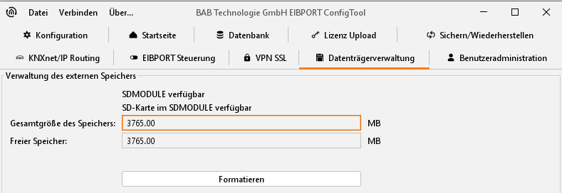 Bei Anschluss eines SDMODULE s wird dies durch den EIBPORT erkannt. Zudem erkennt der EIBPORT auch die verwendete Speicherkarte. Für die Verwendung im EIBPORT ist die Speicherkarte entsprechend zu formatieren. Die Speicherung der Daten auf der Speicherkarte erfolgt in verschlüsselter Form.