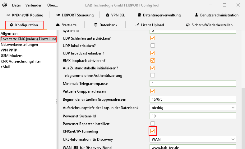 Um das Protokoll zu aktivieren, gibt es ein Kontrollkästchen welches im Menü „Erweiterte EIB (yabus) Einstellungen“ ganz unten zu finden ist. Siehe auch Kapitel KNXnet/IP Tunneling