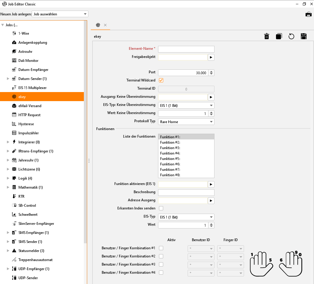 Jeder ekey Job bietet die Möglichkeit bis zu 8 Funktionen anzulegen. Jede Funktion kann eine unterschiedliche Aktion (Gruppenadresse) auslösen. Pro Funktion können 4 Benutzer / Finger Kombinationen festgelegt werden. Ein Benutzer / Finger Kombination kann mehrere Funktionen ausführen.