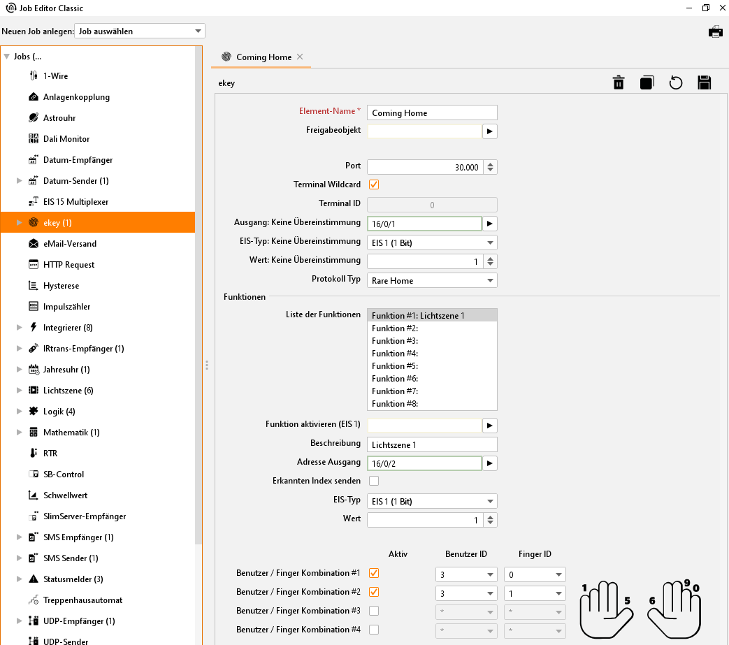 Um bei Übereinstimmung bestimmter Finger am Fingerprintsensor nicht nur den Türöffner zu betätigen (dieser wird direkt von ekey angesteuert), sondern z.B. eine Lichtszene zu starten um im Haus die Beleuchtung für das nach Hause kommen richtig einzustellen, gehen Sie wie folgt vor:
