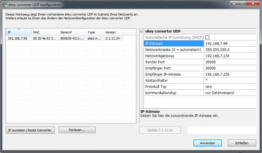 Damit die Fingerprintsensoren Benachrichtigungen an den EIBPORT senden können müssen Sie über einen sog. UDP-Konverter auf das Netzwerk senden können. Zur Konfiguration des UDP-Konverters nutzen Sie bitte die zugehörige Software von ekey.