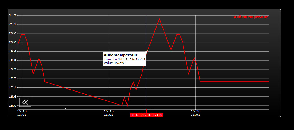 Ist die Visualisierung einmal geöffnet, aktualisiert sich der Graph automatisch nach diesem Intervall (in Minuten). Dabei werden erneut aktuelle Daten aus der EIBPORT Aufzeichnungstabelle abgerufen und neue Messpunkte berechnet.