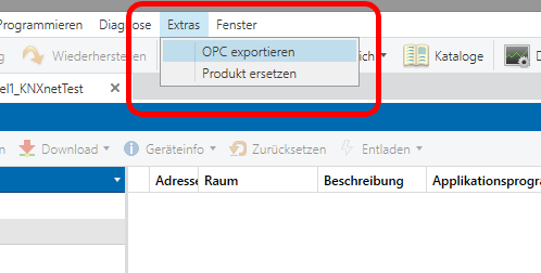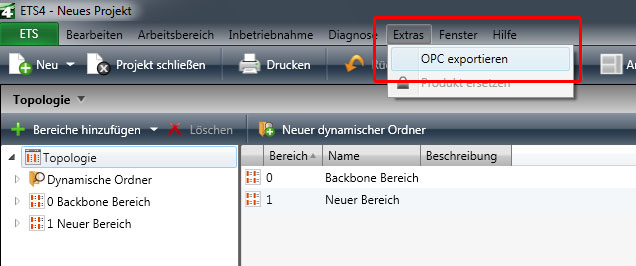 Um den *.esf Export aus der ETS 4 anzustoßen muss das gewünschte Projekt zunächst geöffnet werden. In der Projektübersicht kann dann über das Menü „Extras“ > „OPC exportieren“ eine *.esf Datei an einem beliebigen Ort abgelegt werden.