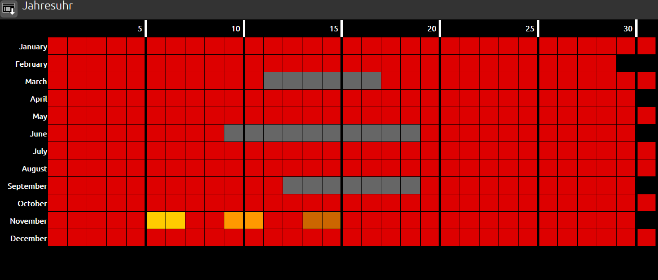 Die Jahresuhr stellt den kompletten Kalender eines Jahres dar. Die Tage werden durch Kästen repräsentiert. Durch den Klick auf einen Kasten öffnet sich ein Pop-Up Menü, mit dessen Hilfe sich die verschiedenen Zustände setzen lassen.