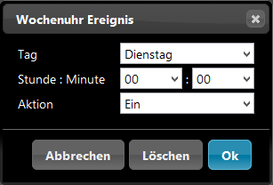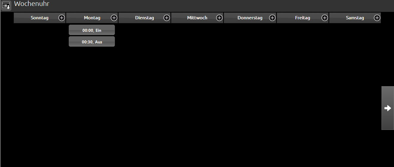 Die Wochenuhr stellt alle Tage einer Woche und zusätzlich 3 Sondertage in 10 Spalten nebeneinander dar. Die Ansicht kann über Pfeiltasten am linken und rechten Bildschirmrand hin und her geblättert werden. Um einen neuen Schaltzeitpunkt anzulegen, dienen die „+“ Symbole neben den jeweiligen Tagen. Durch einen Klick auf „+“ wird ein Pop-Up Menü geöffnet.