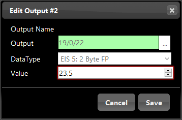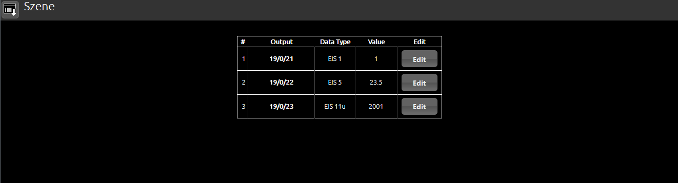 Die Lichtszenen Konfigurationsmaske zeigt alle im Job konfigurierten Ausgänge an. Es werden die Gruppenadressen, der Datentyp und der Wert angezeigt. Der Benutzer erhält über „Edit“ nur die Möglichkeit den Wert zu ändern. Gruppenadresse und Datentyp können hier nicht verändert werden. Durch einen Klick auf „Edit“ erscheint ein PopUp Fenster, über das die Einstellungen möglich sind.