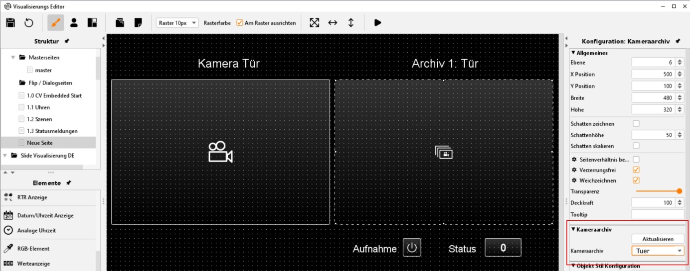 Mit „Aufnahme“ wurde der Trigger des Logikelements Kameraarchiv in die Visualisierung eingefügt. Der „Status“ ist die Darstellung des Status des Logikelements.