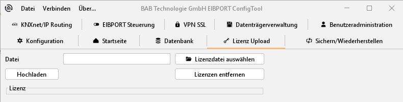 Die Datei wird über den Dateibrowser bei „Lizenzdatei auswählen“ ausgewählt und über „Hochladen“ in den EIBPORT geladen. Darunter befindet sich ein Anzeigefeld mit den Informationen zu der Lizenz.