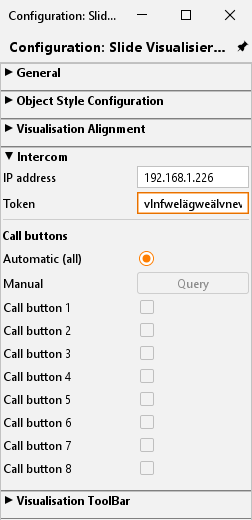 Mit diesem Menü haben Sie die Möglichkeit ein INTERCOM- Sprechsystem in die Visualisierung zu integrieren. Die erforderlichen Daten, Schnittstellen und Protokolle werden durch das INTERCOMMODULE angepasst und für die Visualisierung zur Verfügung gestellt. Aus dem INTERCOMMODULE werden diese Konfigurationsdaten mit Hilfe eines TOKEN in die Visualisierung übertragen.