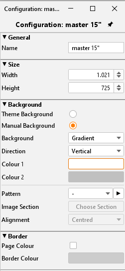 Master Seite: Zuvor angelegte Master Seiten werden mit diesem Drop-down Menü als Vorlage für die ausgewählte Seite benutzt. Die Master Seite bestimmt dann die Größe, den Hintergrund und die Rahmeneinstellung der Seite. Hintergrund und Rahmen können per Kontrollkästchen die Master Einstellungen ignorieren, um abweichende Einstellungen möglich zu machen.