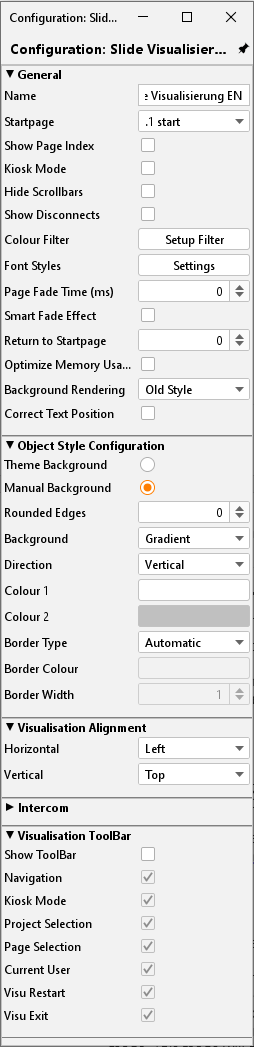 Die Struktur eines Visualisierungsprojektes setzt sich im Groben aus sogenannten „Projekten“ und „Seiten“ zusammen. Hier werden die einzelnen Parameter beschrieben, die durch die Projekte und Seiten bestimmt werden. Viele der Parameter haben einen globalen Charakter, bestimmen also übergreifend Verhalten oder Aussehen.
