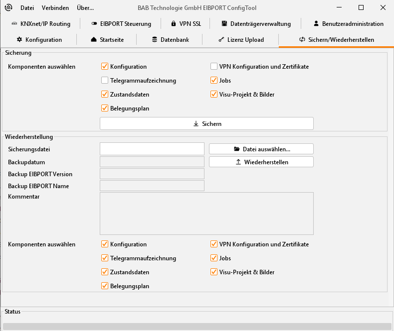Der EIBPORT verfügt über eine „Sichern- und Wiederherstellungs-“ Funktion. Die Konfigurationsdaten, sowie alle Jobs-, Visualisierungs-, und Belegungsplan und Telegrammhistorien- Daten. können gesichert und später wiederhergestellt werden. Sicherung und Wiederherstellung können auch nur für die einzelnen Komponenten erfolgen.