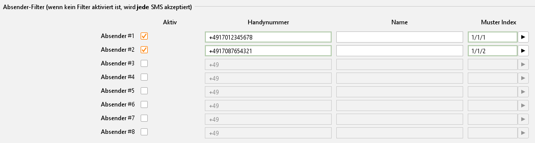 SMS Empfänger – Konfiguration der Absender-Filter