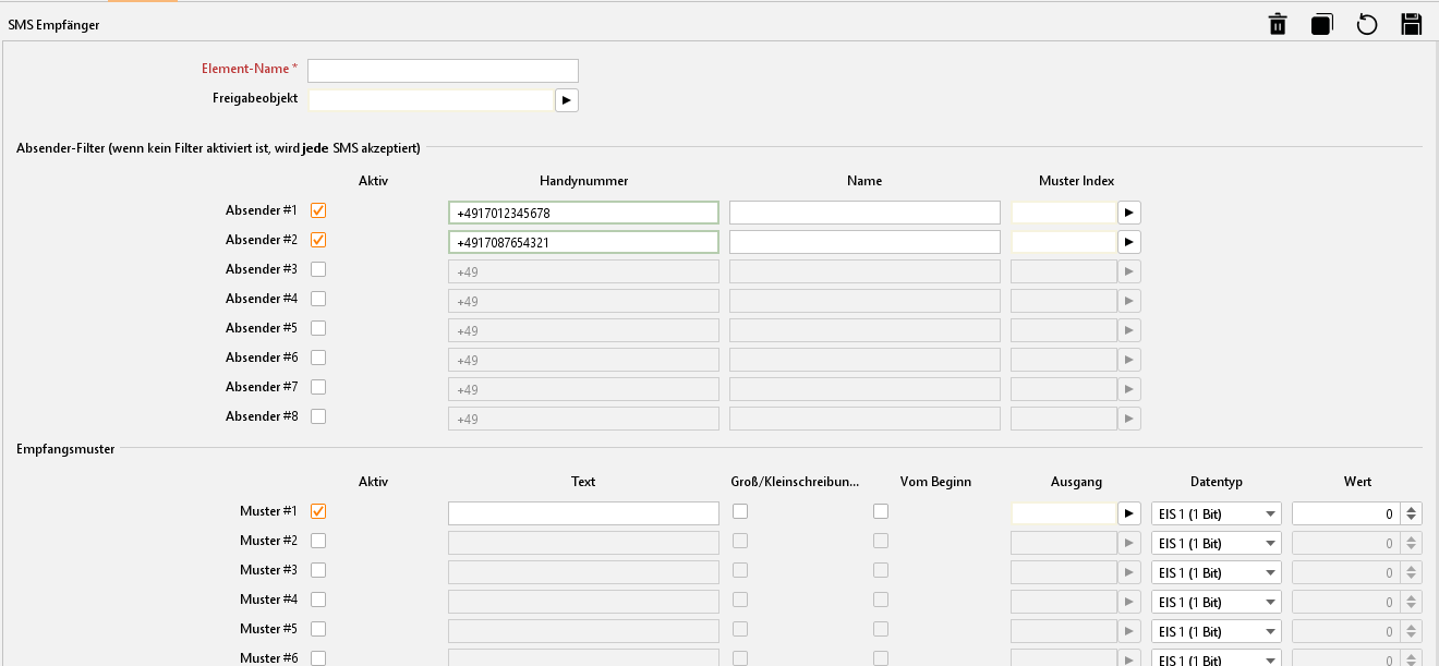 In jedem SMS-Empfänger Job können bis zu 16 Empfangsmuster angelegt werden. Im Empfangsmuster wird der Text bestimmt, der in der SMS-Nachricht an den EIBPORT vorkommen muss, um eine Aktion auszulösen. So kann z.B. der Text „EIN“ eine Schaltung auslösen. Es muss mindestens ein Empfangsmuster angelegt werden.