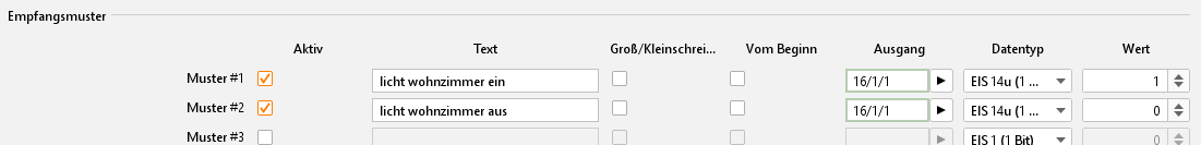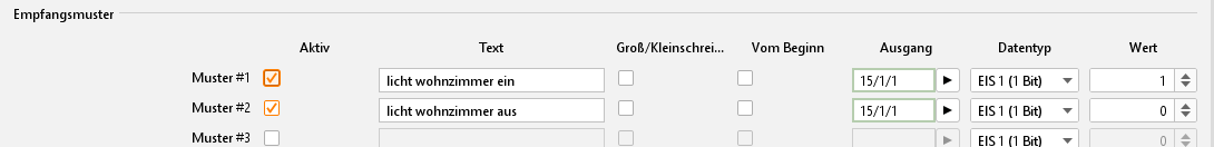 Tragen Sie beispielsweise den Text „licht wohnzimmer ein“, eine beliebige virtuelle Gruppenadresse (Hauptgruppe 16-31) zum Verknüpfen mit einem Logik-Job, und den Wert „1“ in das erste Empfangsmuster ein. Die Checkboxen „Groß/Kleinschreibung“ und „Vom Beginn“ lassen Sie deaktiviert. Füllen Sie danach ein Empfangsmuster nach gleichem Schema für das Ausschalten des Lichtes ein. Demnach tragen Sie beim Text „licht wohnzimmer aus“ und beim Wert „0“ ein.