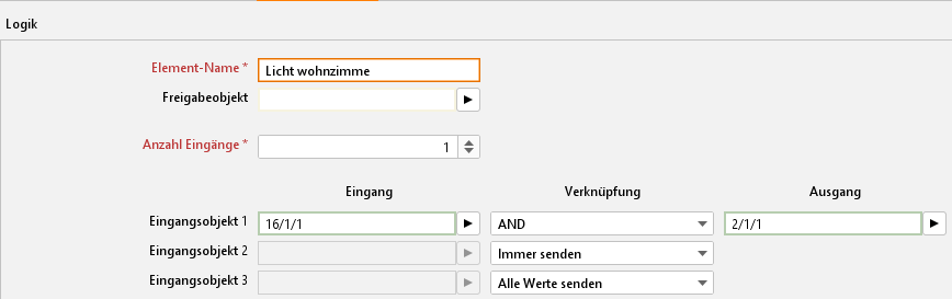 Verwenden Sie auch dort die gleich Virtuelle Adresse wie beim Licht einschalten. Der Job sendet dann bei entsprechender SMS eine „0“ oder eine „1“ auf die virtuelle Gruppenadresse. Diese virtuelle Gruppenadresse führen Sie dann auf einen Logik-Job mit einem Eingang und einer „AND“ („UND“) Verknüpfung. Der Ausgang der Logik ist die reale Gruppenadresse, die das gewünschte Licht schalten soll. Des Weiteren muss der Job mit „Immer senden“ und „Alle Werte senden“ konfiguriert werden. Empfängt der SMS-Empfänger daraufhin den richtigen Text löst er die Virtuelle Gruppenadresse aus, welche wiederum über den Logik-Job die reale Schaltung auslöst.