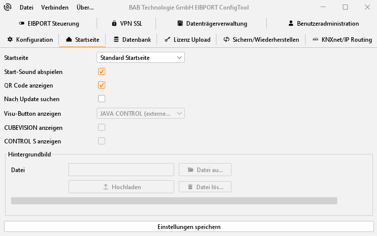 Die Startseite ist die Seite, welche angezeigt wird, wenn die Adresse des EIBPORT aufgerufen wird. In diesem Tab besteht die Möglichkeit festzulegen was als Startseite gezeigt werden soll. Um ein eigenes Hintergrundbild zu nutzen, kann es mit der Funktion im unteren Bereich in den EIBPORT geladen werden.