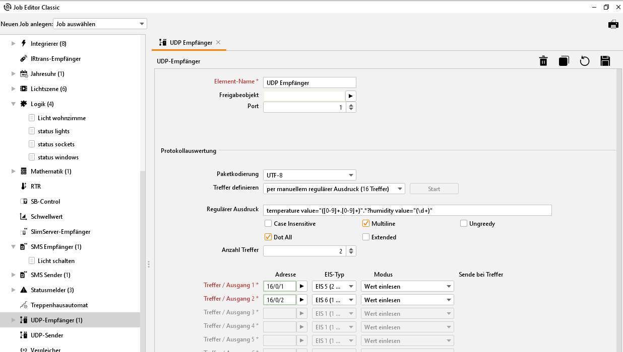 Definieren Sie hier die Gruppenadresse, EIS-Typ und Modus für den jeweiligen Treffer welcher durch () im regulären Ausdruck repräsentiert wird.