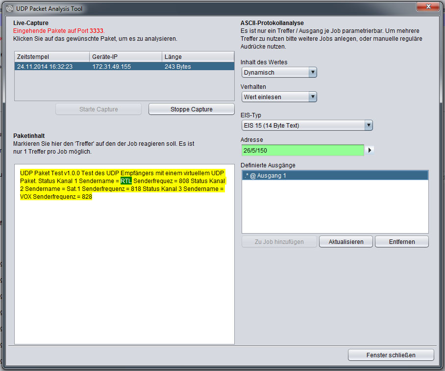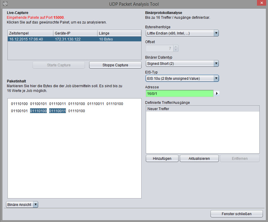 Das UDP Packet Analysis Tool für die Binärprotokollanalyse hilft Ihnen, das empfangene Datagramm aufzuzeichnen, den gewünschten Paketinhalt auf Binärbasis zu definieren, und diesen mit einer Gruppenadresse zu verknüpfen. Die Verknüpfung wird automatisch in die Job Maske übertragen. Es sind 16 Treffer pro Job möglich.