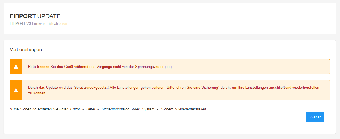 Falls noch nicht geschehen, sichern Sie Ihre Einstellungen, da der EIBPORT während des Updatevorgangs vollständig in den Auslieferungszustand zurückgesetzt wird. Eine Sicherung kann unter "System" - "Sichern & Wiederherstellen" oder im "Editor" - "Datei" - "Sicherungsdialog öffnen" erstellt werden.