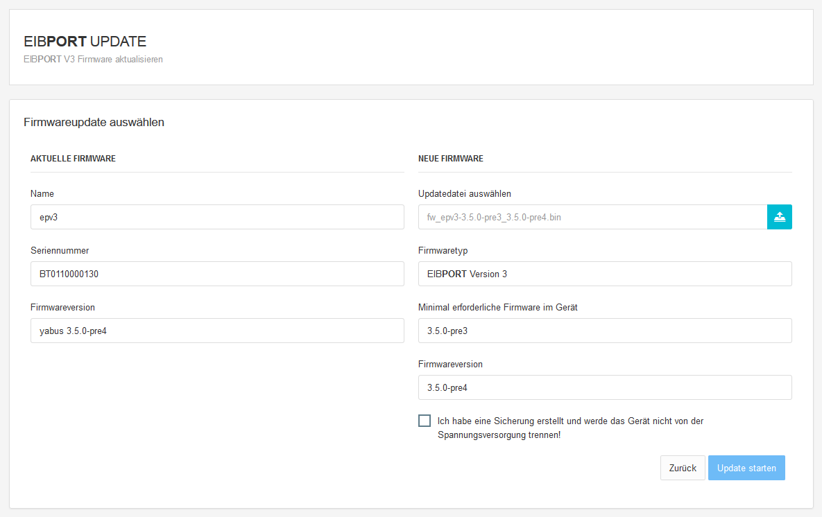 Mit der Firmware Version 3.5.0 steht im EIBPORT ein Updatemechanismus über eine integrierte Webseite zur Verfügung. Der Update-Mechanismus kann über den BAB STARTER (ab Version 1.1.1) oder über die Startseite aufgerufen werden. Durch das Update wird der EIBPORT komplett in den Auslieferungszustand zurückgesetzt. Alle Einstellungen und Projekte gehen verloren! Bitte führen Sie unbedingt eine Sicherung durch, um Ihre Einstellungen und Projekte wiederherstellen zu können.