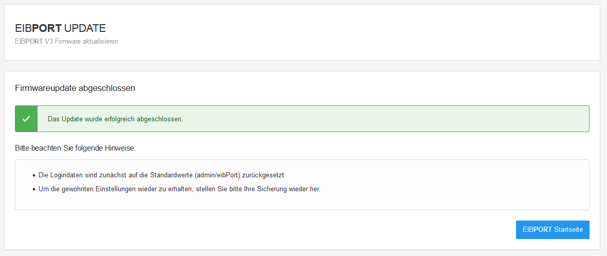 Durch das Update ist der EIBPORT auf die Werkseinstellungen komplett zurückgesetzt worden, so dass die Login Daten wieder Benutzername = admin, Passwort = eibPort sind. Die IP-Adresse; Standard-Gateway und DNS-Server-Adressen bleiben bestehen. Um Ihre Einstellungen wiederherzustellen, wechseln Sie bitte zu "System" - "Sichern & Wiederherstellen".