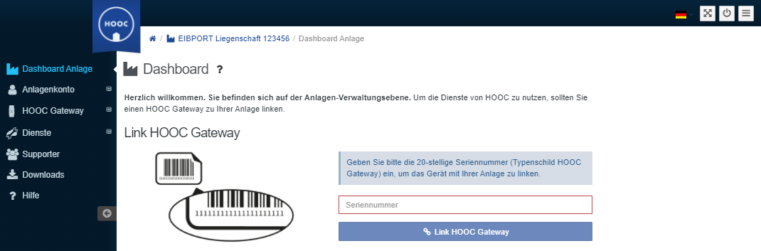 Nach dem Eintragen mit Klick auf „Link HOOC Gateway“ die Seriennummer bestätigen. Wird keine Weiterleitung ausgeführt so ist ein Fehler bei dieser Seriennummer (z.B. Leerzeichen zu viel, die Seriennummer ist bereits in Verwendung).