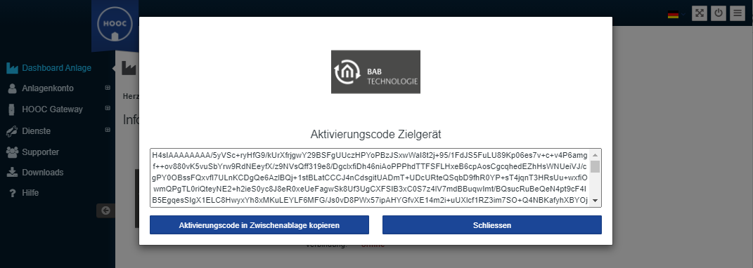 Der Aktivierungscode wiederum wird ins entsprechende Textfeld im HOOC Gateway Manager Ihres Gateways kopiert.