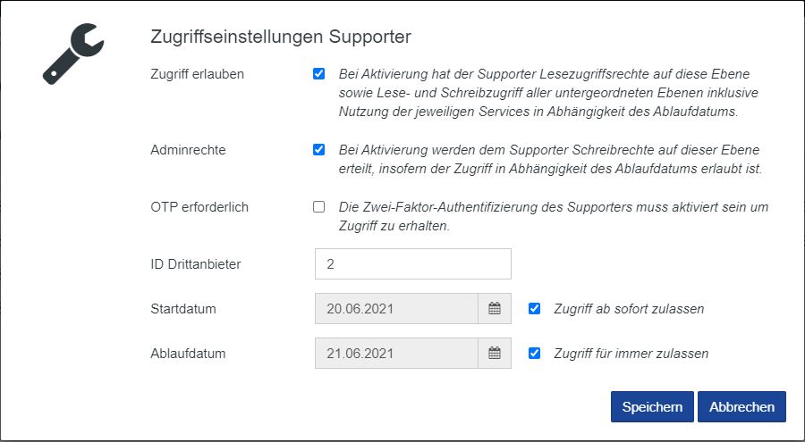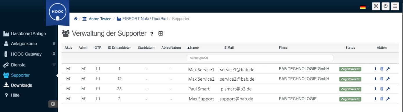 die Supporter (Integratoren) an, die einen Zugriff auf Ihre Anlage erhalten sollen