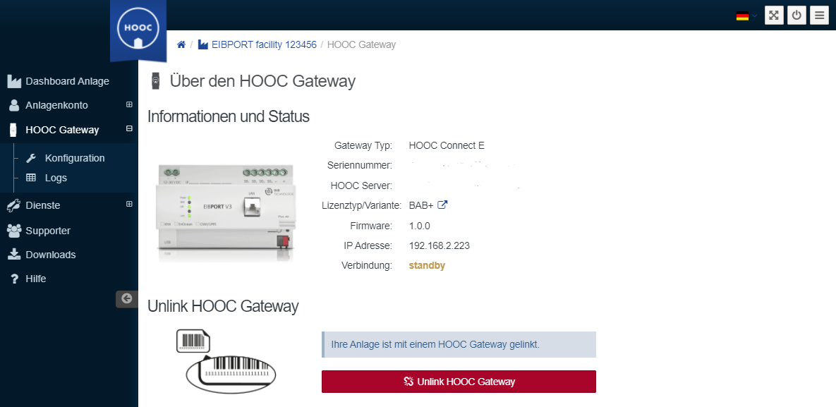 Eine Deaktivierung der HOOC Dienste im EIBPORT kann erforderlich sein, wenn Sie eine zeitlimitierte Lizenz verwenden, bei Änderung oder Stilllegung von Anlage, als auch nur Gerätewechsel des HOOC Gateways.