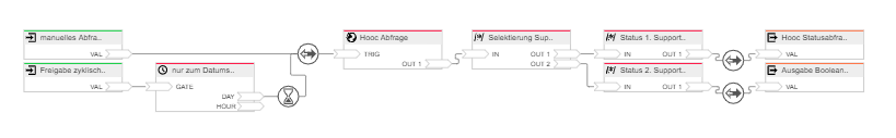Per http Request („Hooc Abfrage“) wird der Status aller eingerichteten Supporter abgefragt und an den Textprozessor „Selektierung Supporter“ übergeben. Dieser Textprozessort liest wiederum den Status jedes einzelnen Supporters aus und gibt diese an die nachfolgenden Textprozessor(-en).