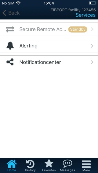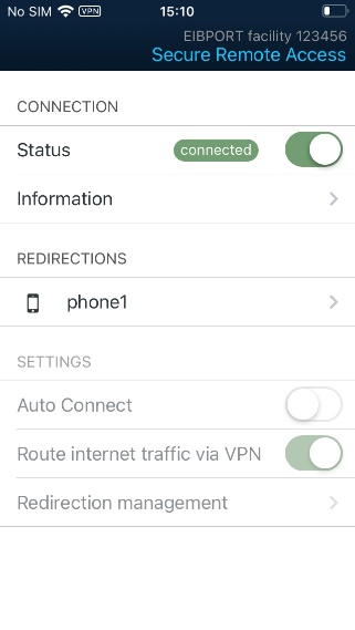 Nach dem Login wird Ihre Anlage angezeigt, die auch online verfügbar ist. Gehen Sie auf das Symbol für <weiter>. Über das Symbol <weiter> im „Secure Remote Access“ kommen Sie zu den Verbindungseinstellungen Ihrer Anlage. Nun ist der Schalter im Status zu aktivieren, so dass VPN aktiviert wird. Die VPN Verfügbarkeit wird auch im Status des iOS Gerätes angezeigt.