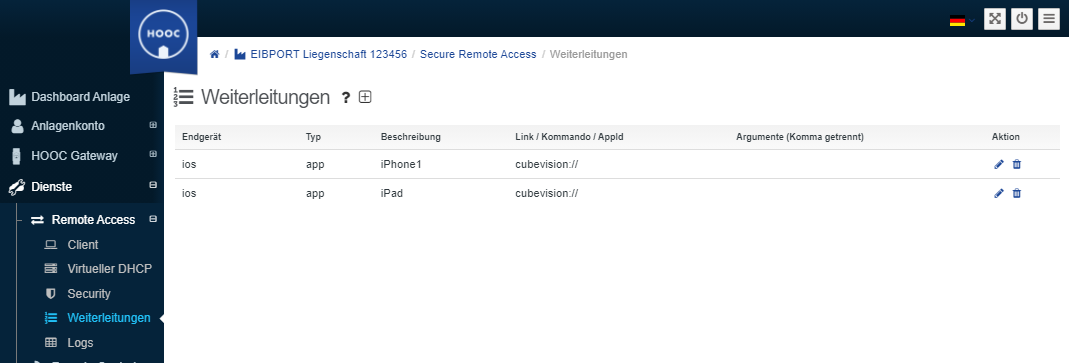 Ohne spezifische Argumente in den Weiterleitungseinstellungen wird nur das Profil zu einer CUBEVISION 2+ APP im iOS Gerät angelegt.