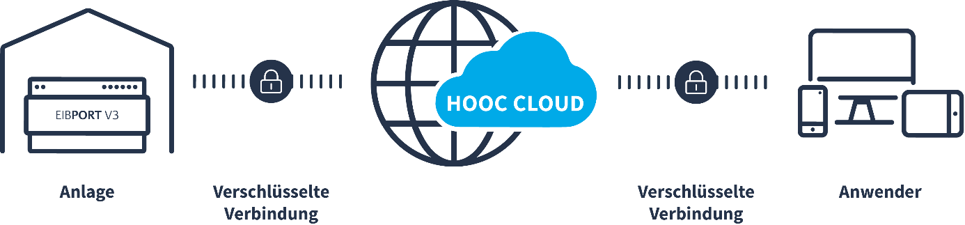 Das Prinzip: Über das im EIBPORT, CUBEVISIONMODULE X, CUBEVISIONMODULE und APPMODULE (nachfolgend als “Gateway” benannt) standardmäßig integrierte HOOC Gateway (HOOC CONNECT E Gateway) wird eine verschlüsselte VPN-Verbindung zur HOOC Cloud aufgebaut.