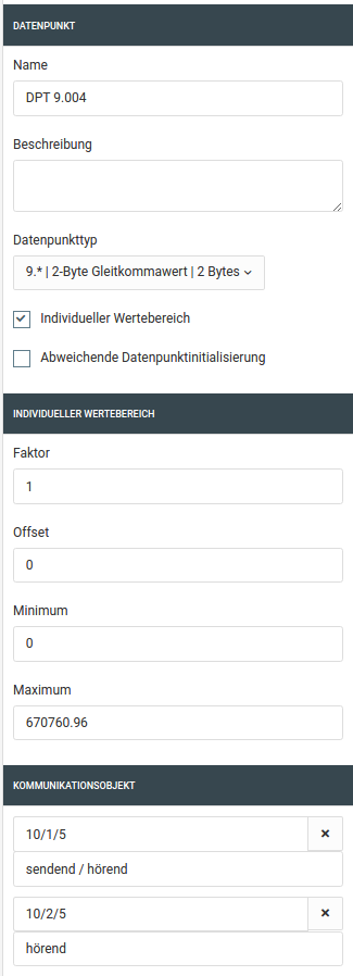 Um individuelle Wertebereiche abbilden zu können haben Sie die Möglichkeit Faktor, Offset, minimalen und maximalen Wert des Datenpunkts zu verändern. Diese Auswahl steht Ihnen bei den numerischen DPT-Haupttypen (z.B. DPT 9.*) zur Verfügung. Es ist z.B. nicht möglich DPT 3.* (Dimmen), DPT 232.* (RGB) oder DPT 16.* (Text) mit einem individuellen Wertebereich zu belegen.