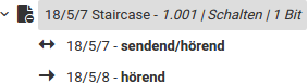 In der Baumansicht der Datenpunkte gilt die oberste Gruppenadresse immer als hörend und sendend und die folgenden nur als hörend. Die Gesamtzahl von Gruppenadressen pro Datenpunkt ist auf 20 beschränkt. Die Reihenfolge lässt sich durch Drag and Drop verändern.