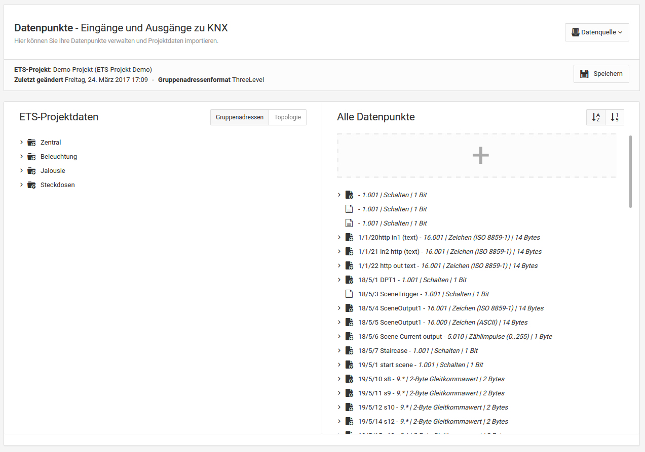 Um die Werteingänge und Wertausgänge innerhalb der Logikgruppen mit Datenpunkten versehen zu können, müssen diese zunächst konfiguriert werden. Die Datenpunkte stellen dabei die Verbindung zur Anlage (KNX-Anlage, andere Funktionsbereiche innerhalb des EIBPORT, bspw. Visualisierung) her. Die Verwaltung der Datenpunkte finden Sie unter "System > Datenpunkte". Zur Erstellung können ETS-Projektdaten, ESF-Dateien oder einfach selbst angelegte Datenpunkte genutzt werden.