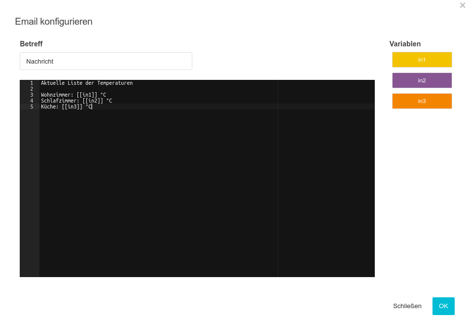 Geben Sie bitte einen beliebigen Text ein und fügen Sie an den entsprechenden Stellen Platzhalter für die Werte der Eingangsvariablen ein, indem Sie auf die entsprechende Variable rechts oben klicken.