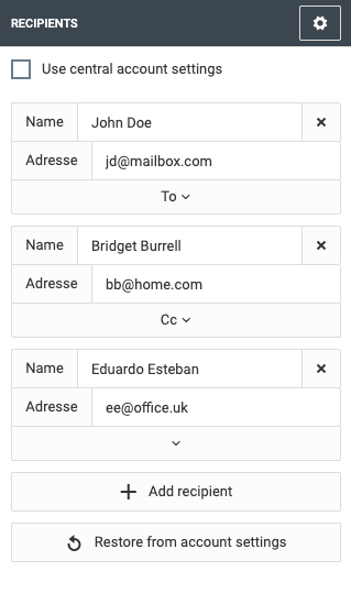 Hier werden die Empfänger für den E-Mail-Sender konfiguriert. Als Standardverhalten werden die Empfänger aus den zentralen Einstellungen des ausgewählten E-Mail-Kontos vorgeschlagen. Sollten Sie jedoch für dieses Logikelement andere Empfänger benutzen wollen, können an dieser Stelle bestehende Empfänger editiert, gelöscht oder neue Empfänger hinzugefügt werden, indem Sie das Häkchen bei "Zentrale Kontoeinstellungen verwenden" entfernen. Klicken Sie auf den "Aus Kontoeinstellungen wiederherstellen"-Button, wenn Sie die Empfänger aus den Kontoeinstellungen wiederherstellen möchten.