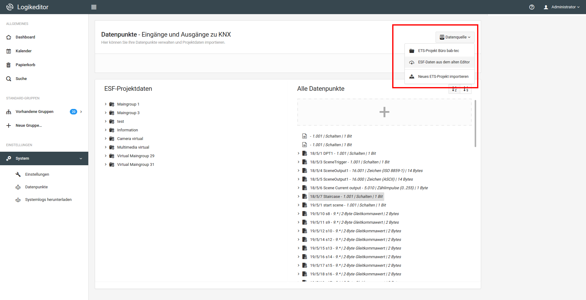 Öffnen Sie im LOGIKEDITOR links im Menü "System" - "Datenpunkte”